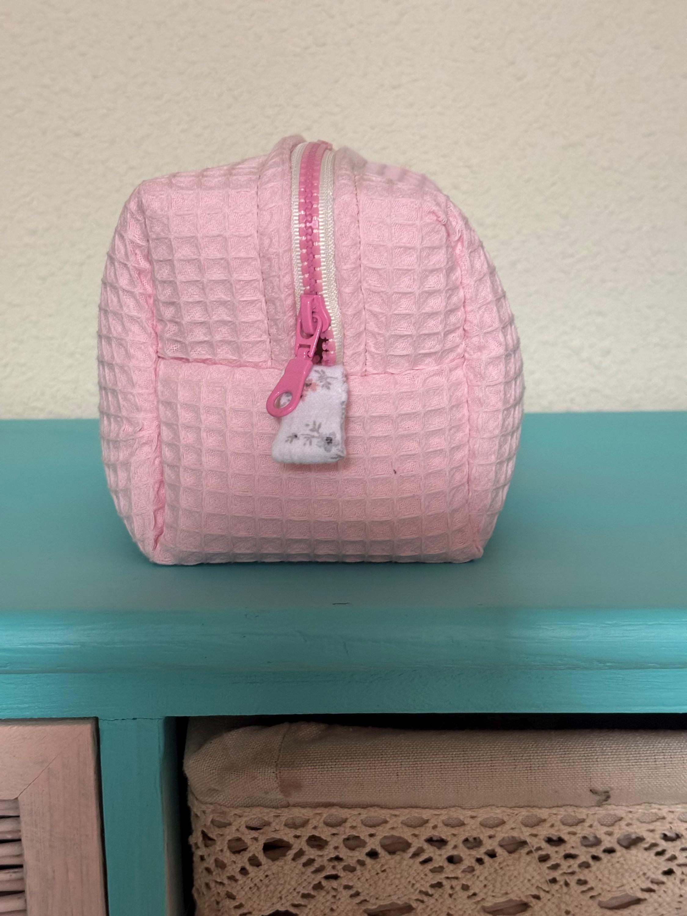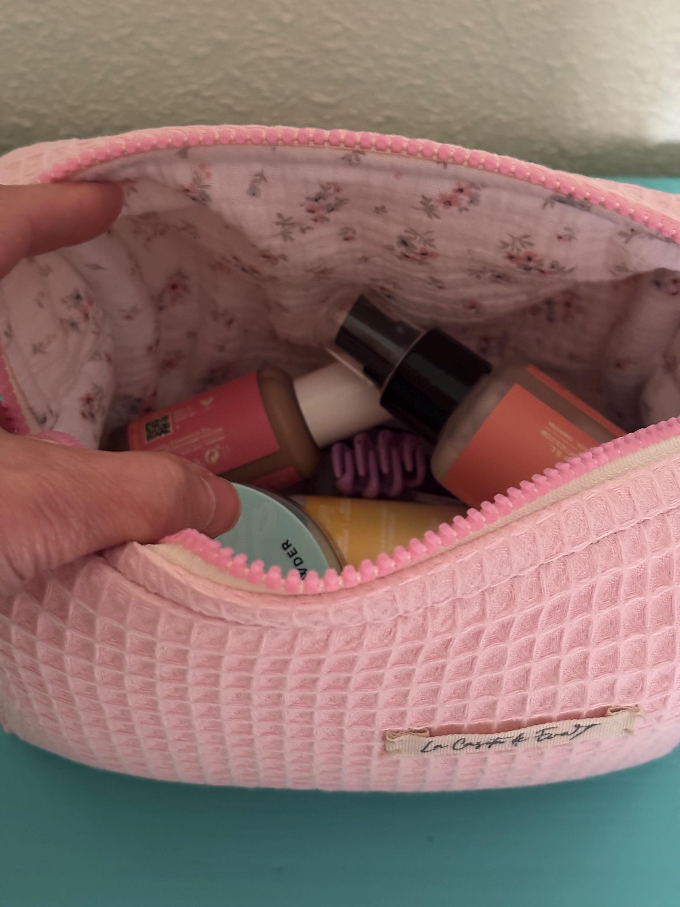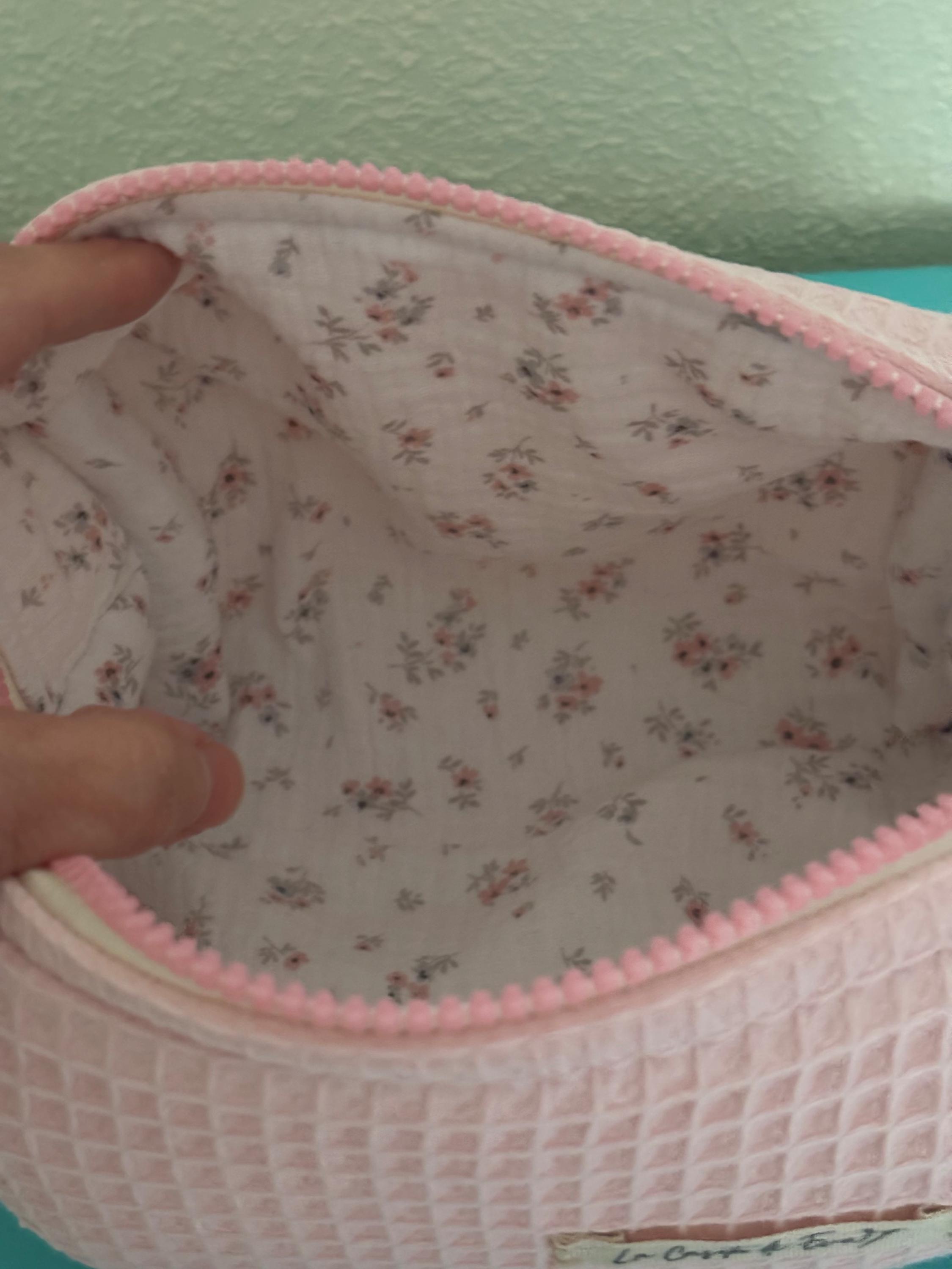 Su exterior de tela de waffle (un algodón muy suave) aporta textura, mientras que el interior de muselina blanca con estampado de florecitas (también 100% algodón) le da un aire romántico y acogedor. Perfecto para guardar maquillaje, accesorios o pequeños objetos dentro del bolso.