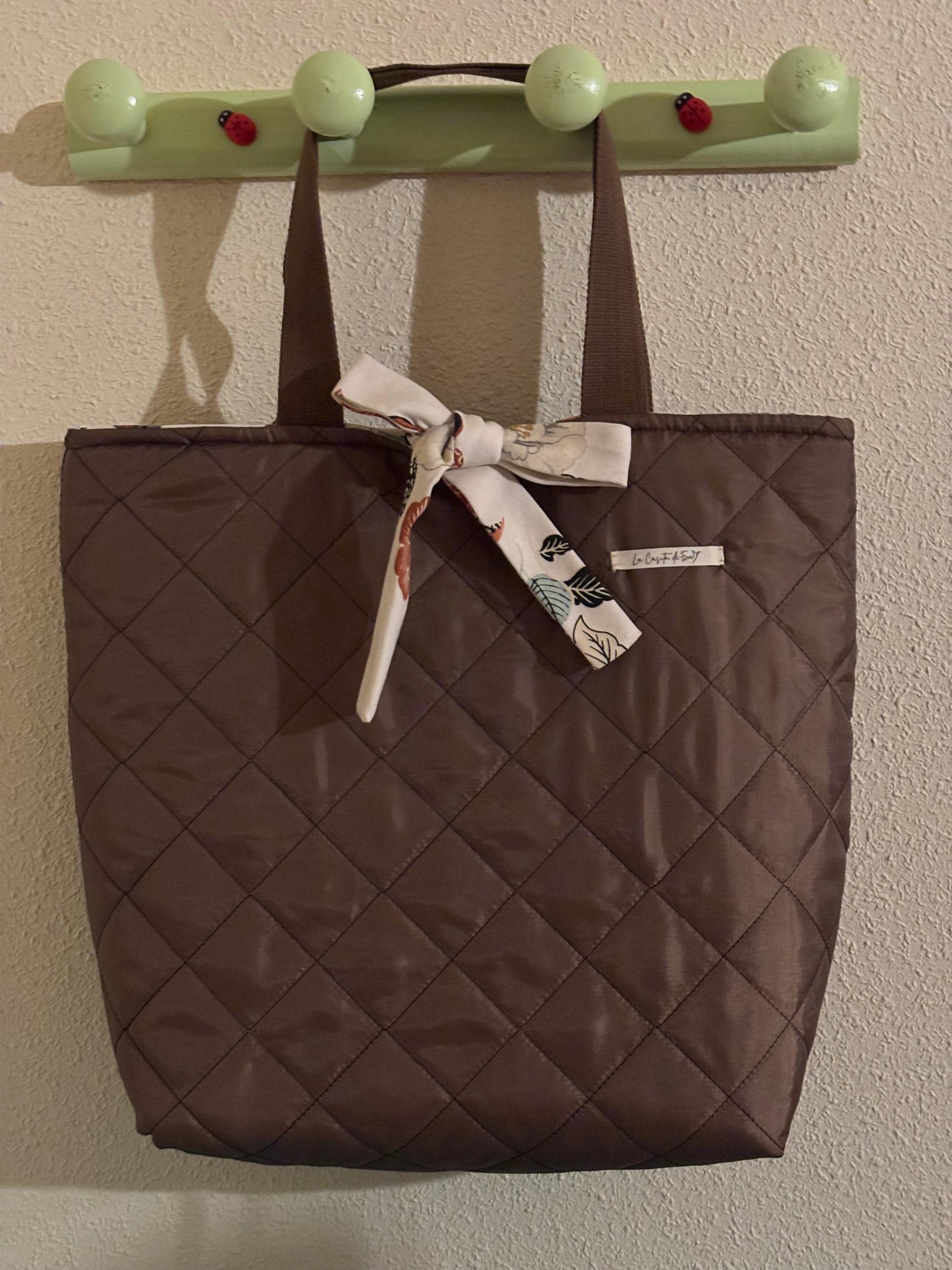 Bolso tote hecho a mano, con diseño atemporal. Confeccionado en tela acolchada color marrón chocolate con costuras formando rombos. Es un bolso práctico y resistente, ideal para acompañarte en tu día a día.