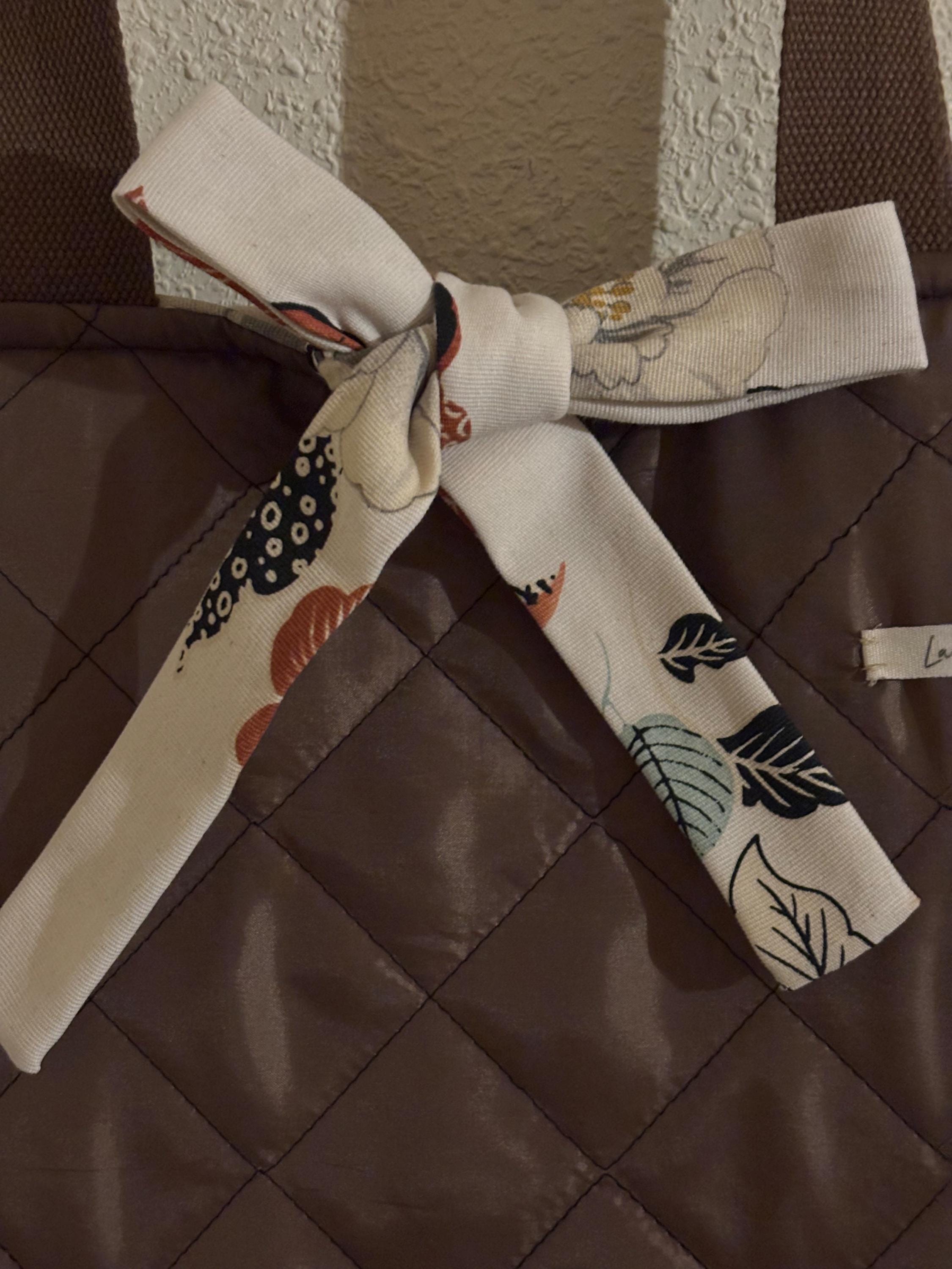 El detalle de la lazada den tela de algodón con estampado otoñal aporta un aire coqueto y distinto, convirtiéndolo en una pieza única y versátil. Sus asas anchas (3,8 cm) permiten llevarlo cómodamente al hombro.