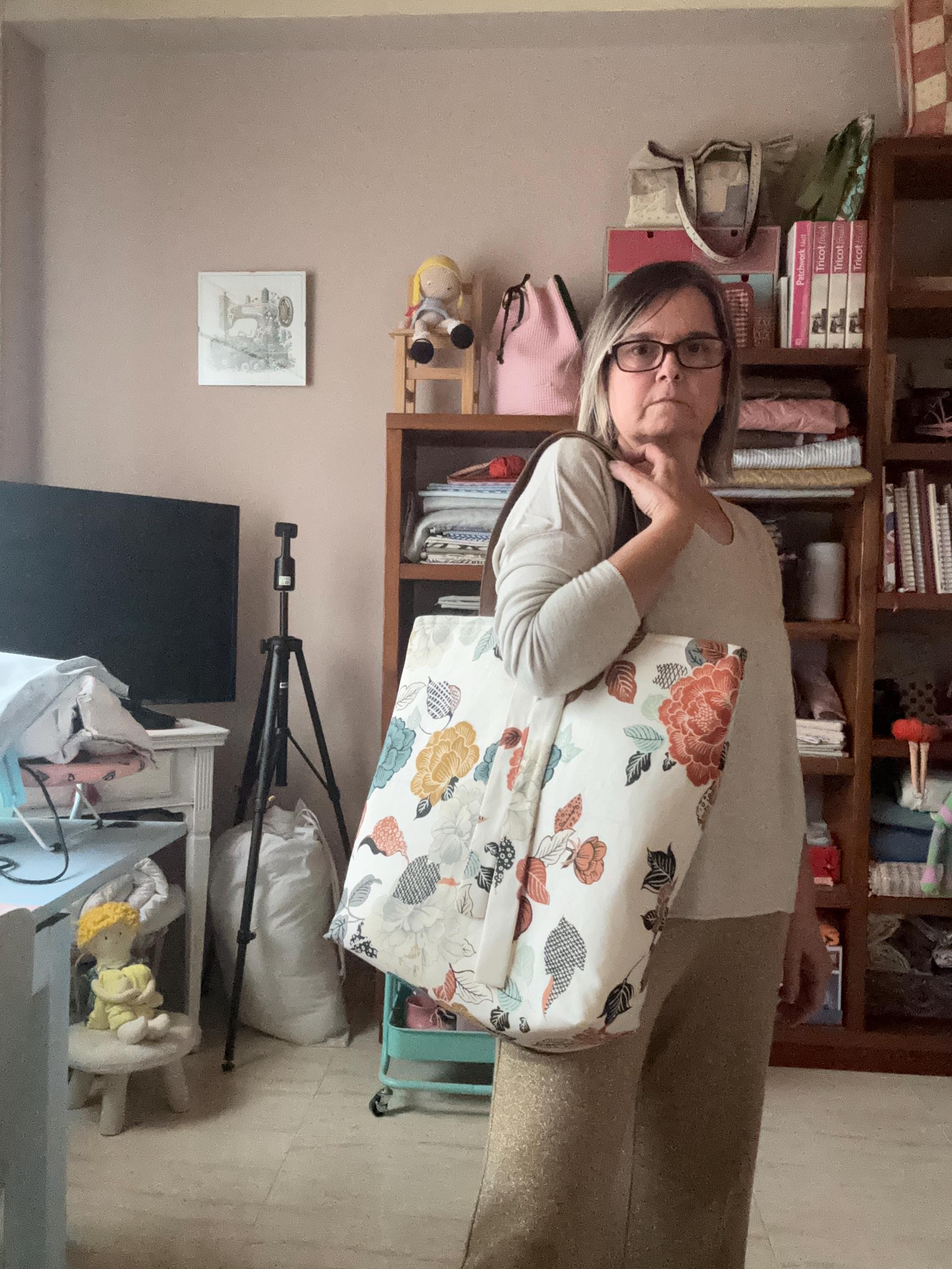 El detalle de la lazada den tela de algodón con estampado otoñal aporta un aire coqueto y distinto, convirtiéndolo en una pieza única y versátil. Sus asas anchas (3,8 cm) permiten llevarlo cómodamente al hombro.