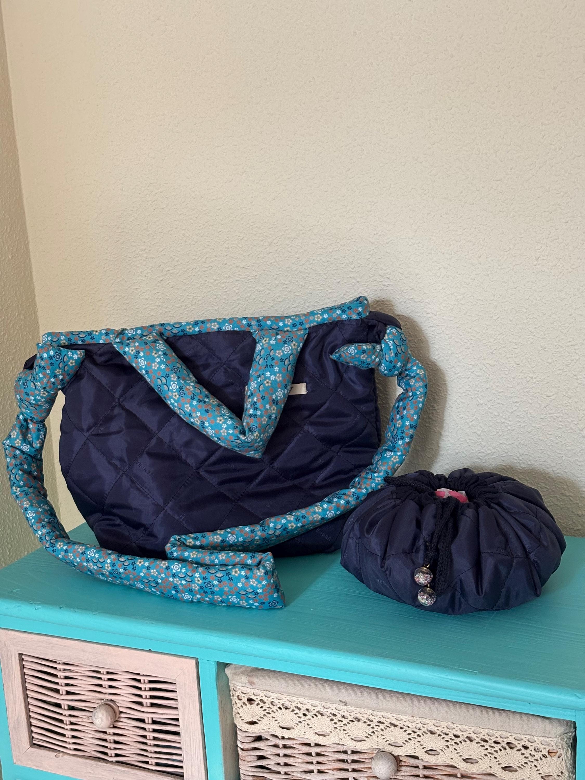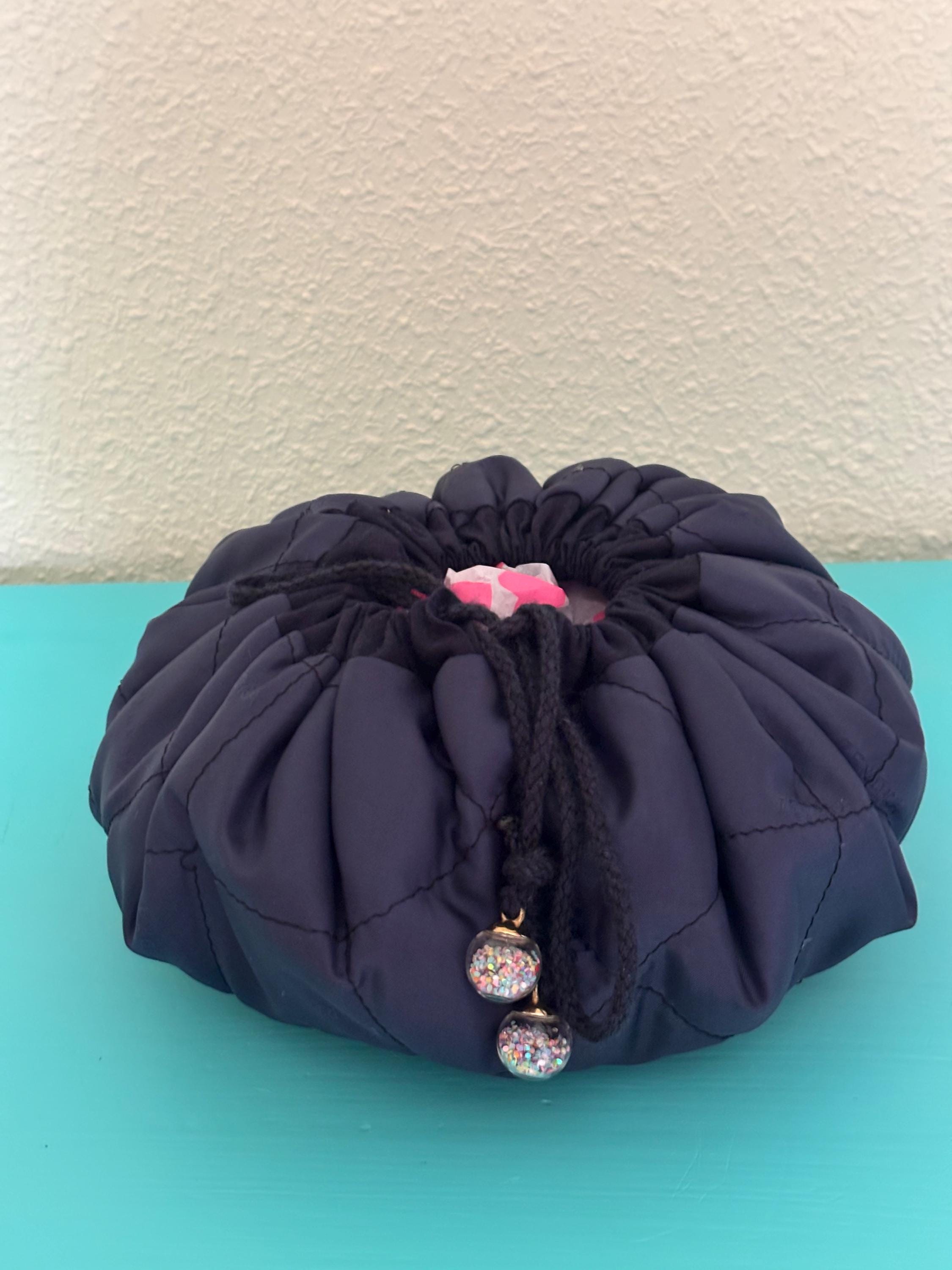 Así continúa creciendo la colección "Otoño en La Casita". Complementos únicos, llenos de encanto y cosidos con mimo. Este neceser circular está confeccionado en nylon y algodón azul con lunares blancos, que mantiene la armonía de la colección. Su forma redonda lo hace tan práctico como original. Al abrirlo por completo se convierte en un espacio amplio y cómodo para guardar tus accesorios, maquillaje o materiales de costura. Lleva un delicado bies a todo su alrededor y un cordón con abalorios en los extremos que permite cerrarlo fácilmente y mantener todo en su sitio.
