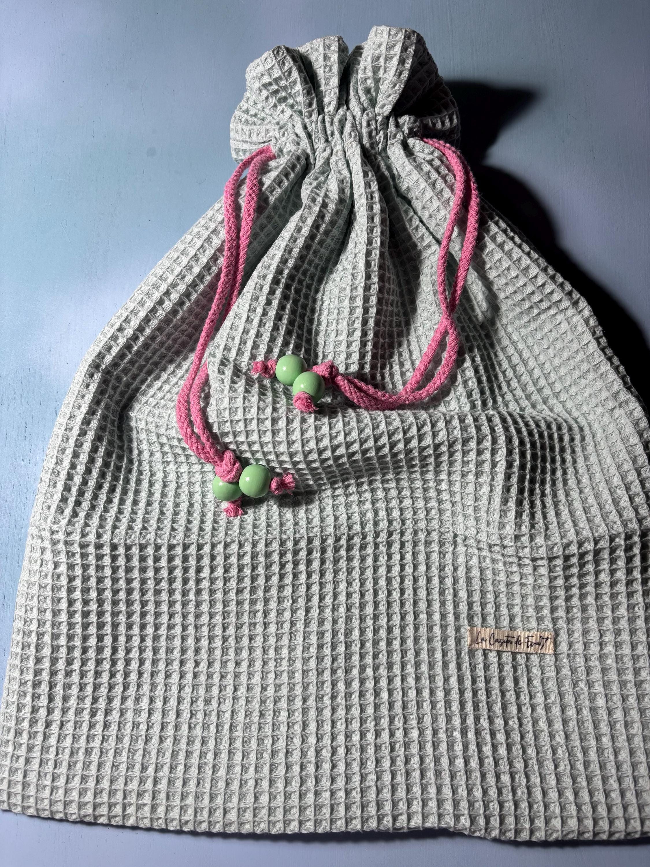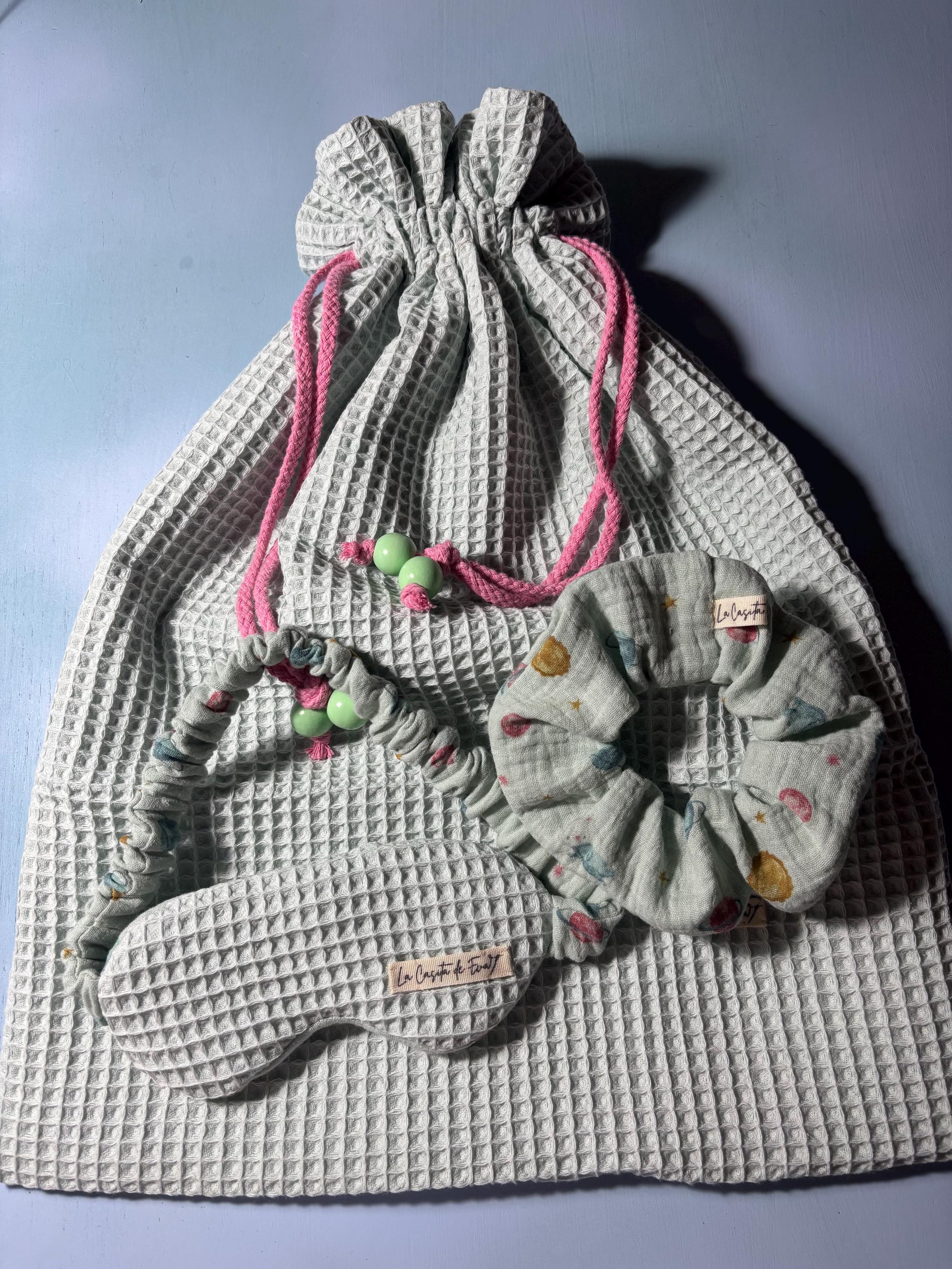 -Saquito guarda pijama: confeccionado en tela de woofle por fuera y muselina por dentro. Mide 50 cm de alto x 40 cm de ancho. Cierre con cordón decorado con abalorios en los extremos.