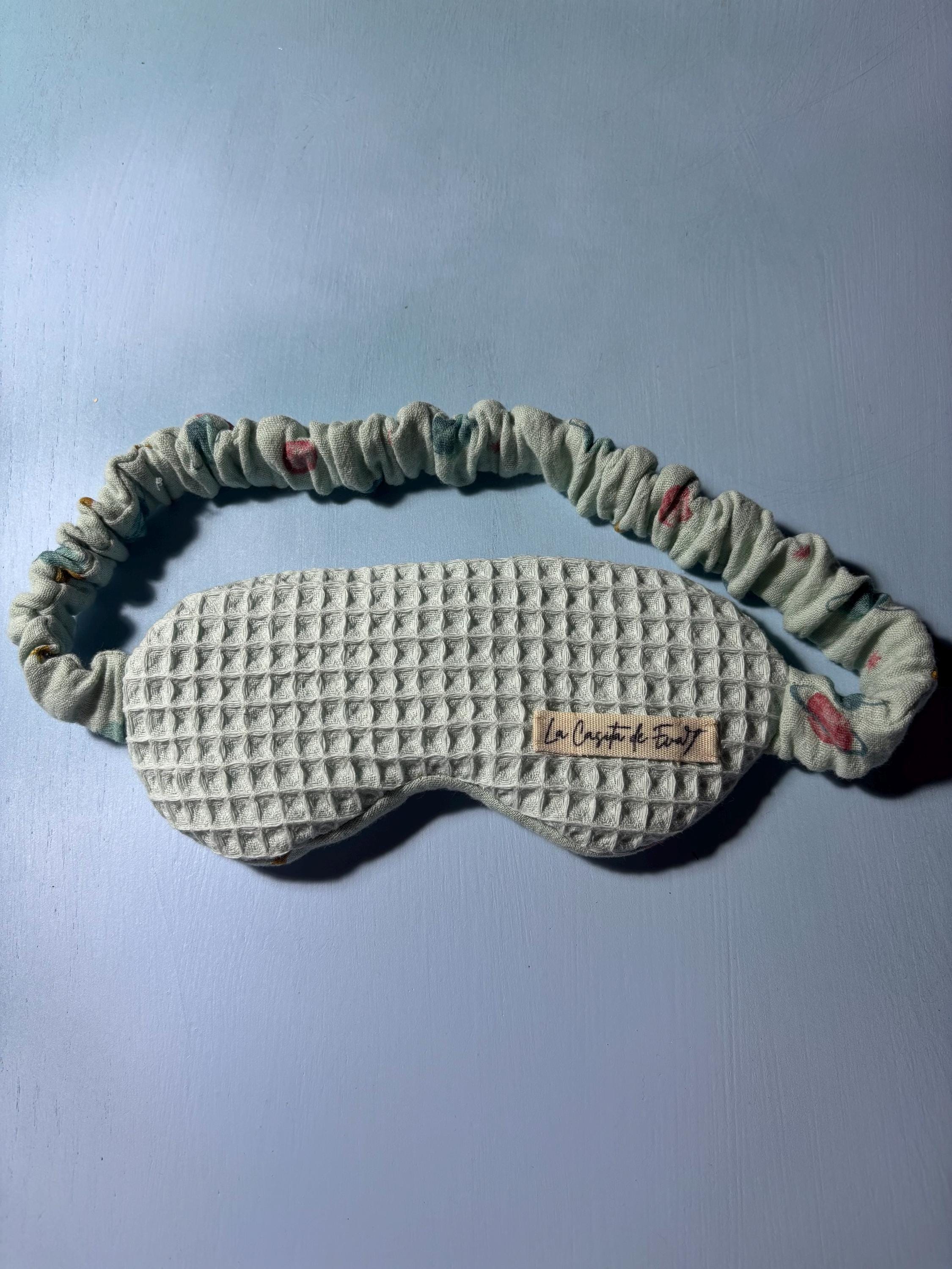 -Antifaz para dormir: una cara de woofle y la otra de muselina, con goma forrada en muselina fruncida.